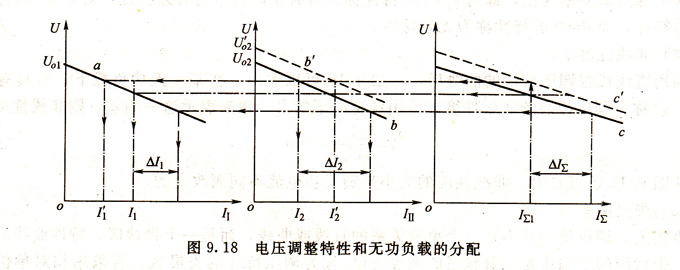 假定两台发电机的调压特性分别为U=f(I1)和U=f(I2),其调差率和空载电压分别为δl、δ2和U01、U02,如图9.18中的特性a和b所示。根据并联运行时发电机电压严格一致的原则,把每一电压下两特性的横坐标相加,就可得到两台发电机总的调压特性,或称电站的调压特性U=f(I∑),如图9.18中的特性c。根据电站的调压特性c,就很容易求出电站在任一无功负载I∑下发电机的电压U和每台发电机的无功电流I1及I2。同样,还可求出在这一工况下,负载总无功电流增加△I∑后,两台发电机无功电流的增量△I1及△I2。